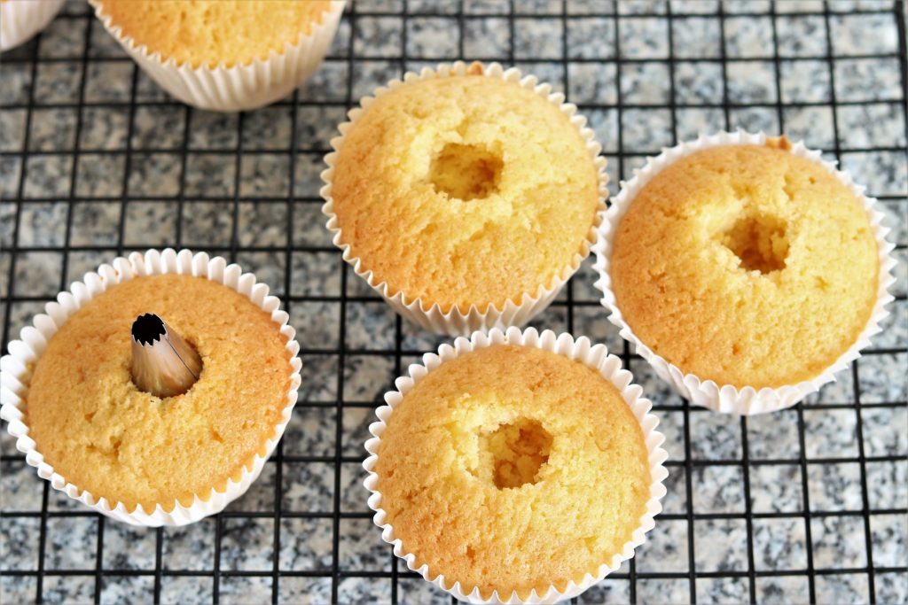 Make the cupcakes according to the recipe. When they have cooled down, press a piece out of the cupcake in the middle with the back of a nozzle (look at the photo).