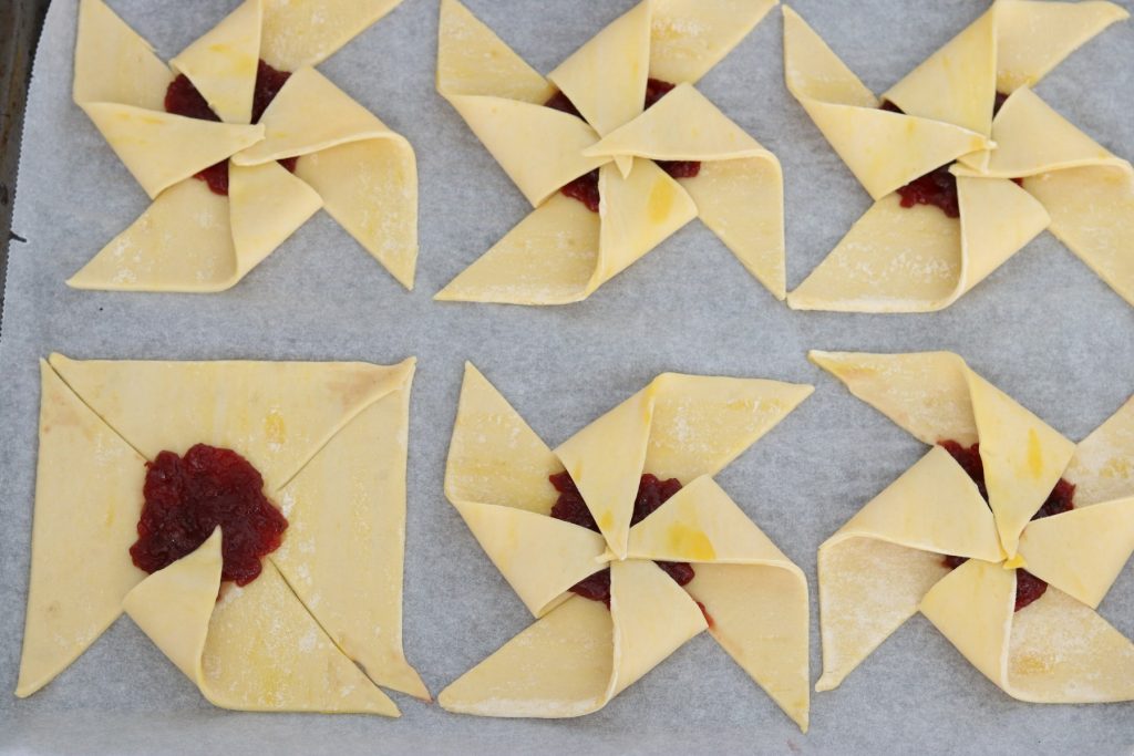 Doe in het midden van elk plakje bladerdeeg een koffielepel confituur. En snij vanuit elke hoek tot net aan de confituur ( dus niet helemaal tot in het midden, de sneden mogen elkaar niet raken)